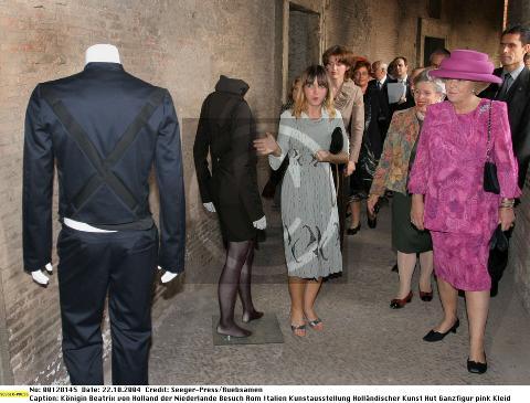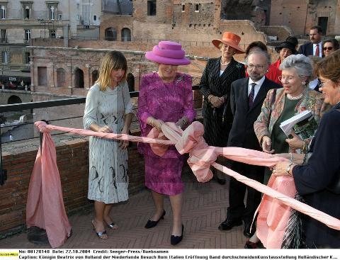 "Königin Beatrix von Holland der Niederlande. Besuch Rom Italien. Eröffnung. Band durchschneiden. Kunstausstellung Holländischer Kunst.". Found here and here.